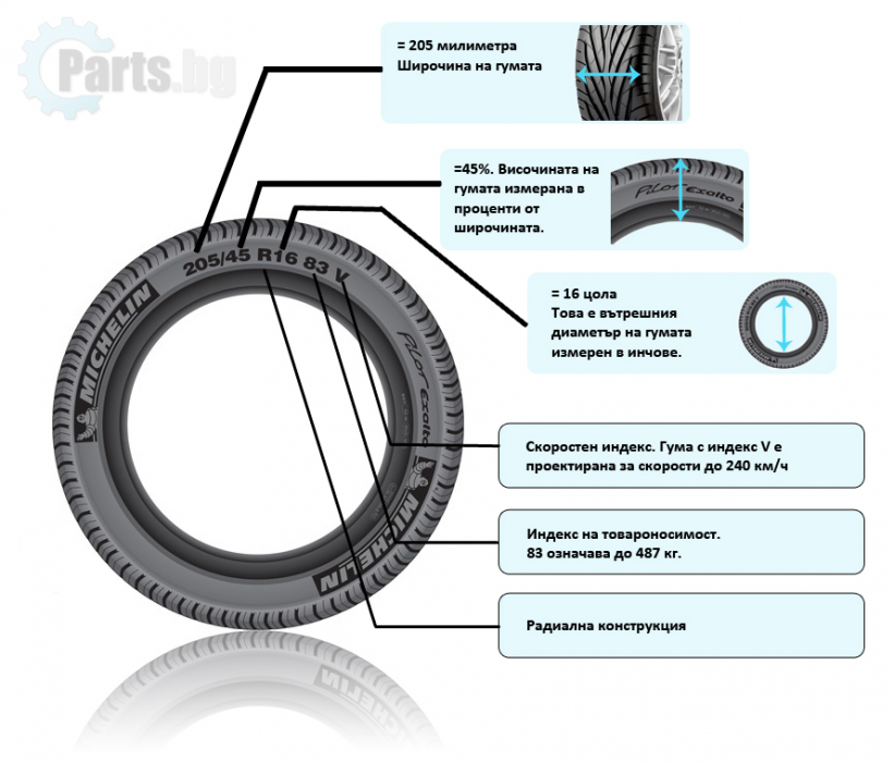 Какво означават цифрите и кодове като 205/55/R16, изписани по страничната част на гумите? Щракнете върху снимката, за да научите повече.Подграйферният слой е дебел от 25 до 40% от височината на грайферите. Той трябва да предпазва гумата от пробождане с остри предмети, каквито изобилстват по нашите улици и пътища. Страницата на протектора (или страничната част на гумата) осигурява връзката между протектора и борда. Обикновено дебелината на страницата е от порядъка на 2 - 5 мм, като стремежът е да се прави по възможност по-тънка, за да се намали хистерезисът (вътрешното триене) при непрекъснатото й деформиране. Страницата не поема никакви вертикални сили, защото те се поемат от въздуха, с който е напомпана гумата. Онази част от гумата, която се закрепва върху джантите, се нарича борд. Основната му част е бордовият обръч - стоманено телено въже, покрито с гумиран текстил. Благодарение на него между гумата и джантата се създава необходимата плътност, която дава възможност безкамерната гума да се напомпа, без опасност въздухът да изтече между борда и джантата. Затова разбирасе трябва да имате и изправни джанти, без кривини и пукнатини. Обикновените метални джанти са по-евтини от алуминиевите, но не са толкова здрави. Със времето при шофиране по неравни пътища, металните джанти могат да се деформират по ръба по такъв начин, че да не могат да уплътняват добре борда и да изпускат въздух. Алумиевите джанти имат по-устойчив контактен ръб, но при силен удар в неравности по пътя не са достатъчно еластични и се сцепват. Това е поправимо в някои случаи, чрез аргонова заварка.